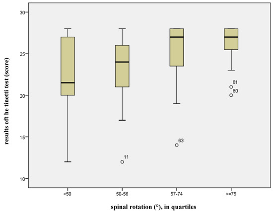 If the spinal mobility modes are considered separately, it is apparent that, in addition to the already acknowledged risk factors, only spinal rotation has a significant effect on the risk of falling (p = 0.019). Figure 4 illustrates how the point score of the Tinetti test increases in proportion to spinal rotation. The larger the rotation amplitude, the better the balance and security of gait. The risk of falling arises if the cut-off value of 20 points is not achieved in the Tinetti test. The widest spread of spinal rotation occurs in the lowest quartile (<50°, n = 24), but few subjects fall below the cut-off-value (median = 22 points). Only 25% of the subjects in this quartile achieved a point score ≤ 20 (smallest value 12).