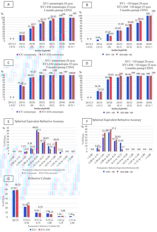The cumulative uncorrected visual acuity (UCVA) and CDVA showed no significant differences between the XY1 and XY1-EM emmetropia groups (