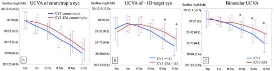 Figure 2A). However, in the nondominant eye, the XY1-EM −1D group demonstrated significantly better UCVA at 40 cm (0.33 ± 0.19 vs. 0.19 ± 0.17;