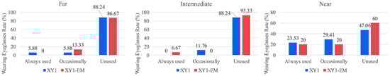 Spectacle dependence for intermediate distances was significantly lower in the XY1-EM group compared to the XY1 group (