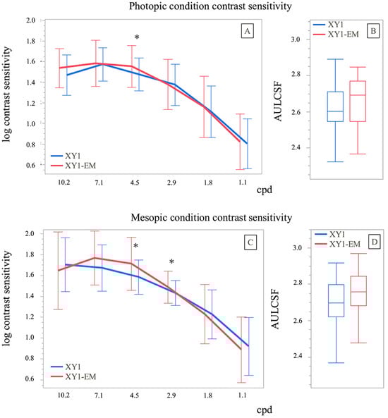 p = 0.04). Under mesopic conditions, the XY1-EM group demonstrated better contrast sensitivity at 2.9 cpd (1.59 ± 0.16 vs. 1.71 ± 0.25;
