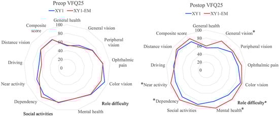 In the VFQ-25, no significant preoperative differences were found between groups. Postoperatively, the XY1-EM group demonstrated significantly higher scores in general vision (