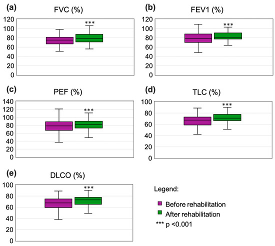 While pre- and post-rehabilitation results indicated no signs of obstruction (FEV1/FVC > 75%), improvements in median TLC were significant (from 67.3% to 71%, p < 0.001; Figure 2d), with median DLCO values increasing from 67.8% to 74% (p < 0.001; Figure 2e).