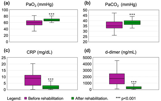 Box whisker plots showing comparison of results pre- and post-rehabilitation for the following parameters: (a) PaO2, (b) PaCO2, (c) CRP, and (d) d-dimer. Box represents median, 25th percentile, and 75th percentile, and whiskers represent min and max values.