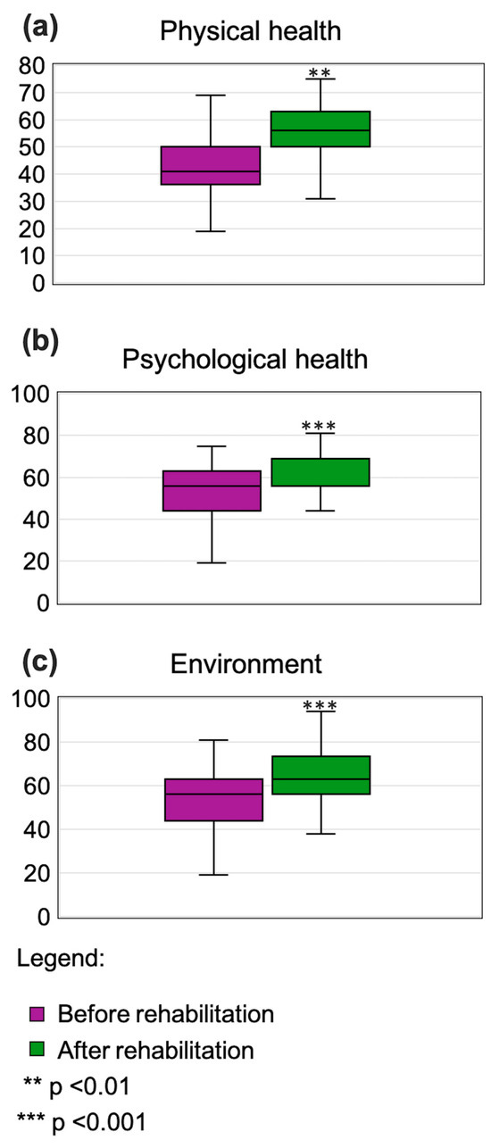 Results of quality-of-life assessments are summarized in Table 2. Rehabilitation resulted in significant improvements in three of four quality-of-life domains: physical (p < 0.01; Figure 4a), psychological (p < 0.001; Figure 4b), and environmental (p < 0.001; Figure 4c).