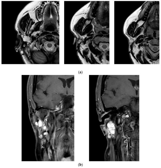 Magnetic resonance imaging (MRI) of the head and neck performed during the most recent recurrence of the pleomorphic adenoma. (a) Axial T2-weighted image showing a well-circumscribed, multilobulated lesion in the deep portion of the right parotid, with hyperintense signal and clear demarcation from adjacent structures. (b) Coronal contrast-enhanced T1-weighted image revealing intense peripheral enhancement of the lesion, consistent with a recurrent multinodular pleomorphic adenoma.