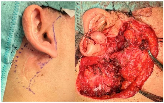 - Roh, J.L. Feasibility and safety of preauricular incision for extracapsular dissection in benign parotid tumors. Eur. Arch. Oto-Rhino-Laryngol. 2025, 282, 1437–1441. [Google Scholar] [CrossRef] [PubMed]