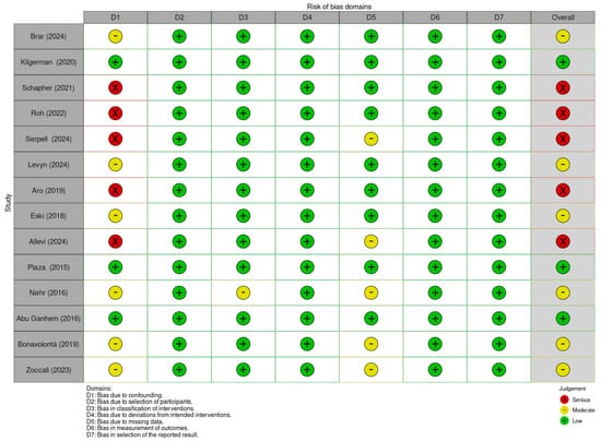 Summary of risk of bias assessment for non-randomized controlled trials using ROBINS-I V2 tool. Brar et al. (2024) [13]; Kligerman et al. (2020) [14]; Schapher et al. (2021) [15]; Plaza et al. (2015) [16]; Eski et al. (2018) [17]; Allevi et al. (2024) [18]; Levyn et al. (2024) [19]; Aro et al. (2021) [20]; Nøhr et al. (2016) [21]; Roh (2022) [22]; Roh (2025) [23]; Serpell et al. (2024) [24]; Abu Ghanem et al. (2016) [25]; Bonavolontà et al. (2019) [26]; Zoccali et al. (2019) [27].