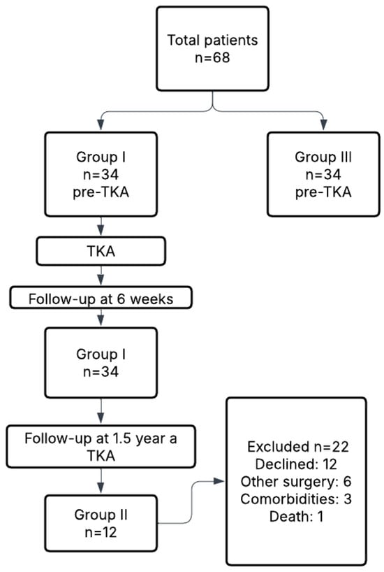 For clarity, Group I included 34 patients (18 women, 16 men), Group II comprised a subset of 12 patients (6 women, 6 men) reassessed 1.5 years postoperatively, and Group III consisted of a separate cohort of 34 patients (15 women, 19 men) evaluated prior to TKA. All participants had no degenerative changes exceeding grade I in the contralateral knee. Radiographic assessments were performed in standing anteroposterior and lateral views and evaluated by radiology specialists. Table 1 presents the demographic characteristics of all study groups. No statistically significant differences were observed between Group I, Group II, and Group III in terms of age, body weight, height, or BMI (p > 0.05), confirming that the groups were demographically comparable. Specifically, Group I was used to assess short-term postoperative outcomes, Group II to evaluate long-term recovery at 1.5 years, and Group III served as a non-operated control group for baseline comparison. A flowchart illustrating participant allocation, follow-up, and reasons for exclusion from long-term analysis is presented in Figure 1.
