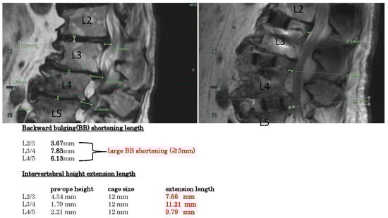 Among all 530 intervertebral spaces, significant shortening of the backward bulging length (3 mm or more) was observed in 353 intervertebral spaces. Among these, 339 intervertebral spaces were those where a cage 3 mm or larger than the preoperative intervertebral height was inserted. In only 14 intervertebral spaces, cages with a height less than 3 mm greater than the preoperative intervertebral height were inserted, but significant shortening of the backward bulging length was observed.