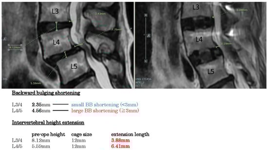 If this backward bulging shortening was larger than 3 mm, we defined it as large shortening. We also measured the intervertebral height extension and divided it into these 3 groups: less than 3 mm, more than 3 mm, and 4 mm (Figure 2).