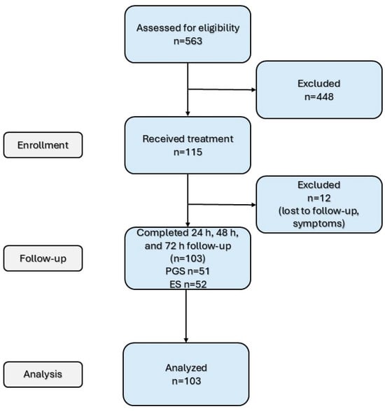 A total of 115 patients were considered eligible for this study (Figure 1). The patients were treated (as they presented or were referred to) by three endodontic specialists (ES) with at least 5 years of experience in this field or by three postgraduate students (PGSs) enrolled in the endodontics residency program. No randomization or blinding took place. A total of 59 patients were treated by ESs, while PGSs treated 56 patients. The treatments were performed in two visits: the instrumentation phase and the obturation phase. This protocol (i.e., in which patients require two visits) is commonly used in the endodontic department where the study took place, and it was used for all patients. Before the beginning of the study, a detailed presentation including the study protocol was held for calibration, in which all operators participated. The session included practical training using extracted teeth to ensure uniformity in treatment and obturation procedures. In cases where discrepancies arose during training, they were discussed and resolved through consensus under the supervision of an ES to ensure consistency and reliability. All of the PGSs were supervised during clinical procedures by an operator accustomed to the protocol, but the operator did not interfere with the treatment.