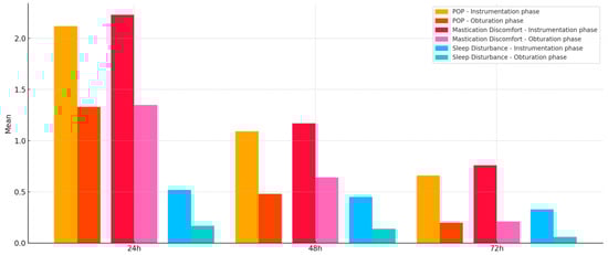 Mean values for POP, mastication discomfort, and sleep disturbance evaluation at 24 h, 48 h, and 72 h after the instrumentation and obturation phases for the whole cohort.