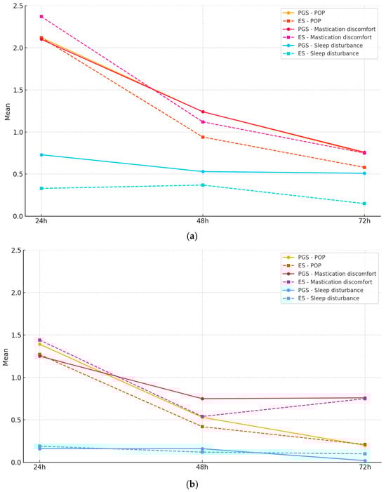 (a): POP, mastication discomfort, and sleep disturbance for PGSs and ESs at 24, 48, and 72 h following the instrumentation phase. (b): POP, mastication discomfort, and sleep disturbance for PGSs and ESs at 24, 48, and 72 h following the obturation phase.