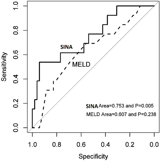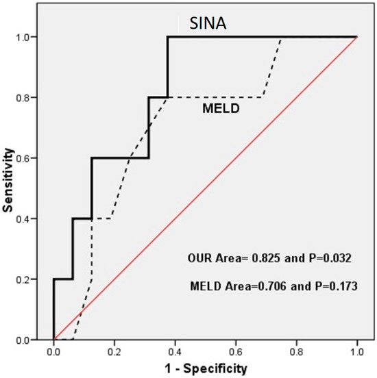 Comparison of the sensitivity and specificity of Sina and MELD scores in the validation group.