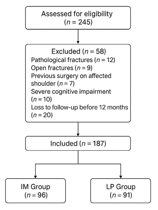 A total of 245 patients with proximal humerus fractures were initially screened. After applying the inclusion and exclusion criteria, 58 patients were excluded for the following reasons: pathological fractures (n = 12), open fractures (n = 9), prior surgery on the affected shoulder (n = 7), severe cognitive impairment (n = 10), and loss to follow-up before 12 months (n = 20). The final cohort included 187 patients who were assigned to two treatment groups: 96 patients underwent intramedullary nail fixation (IM group) and 91 patients received locking plate fixation (LP group). Data were extracted from electronic medical records and patient charts. A flow diagram illustrating patient selection is presented in the Results section.