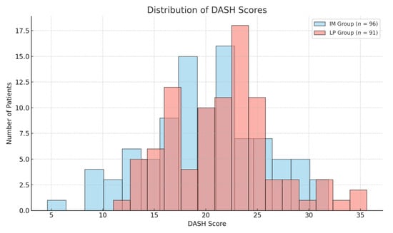 p = 0.578). Among patients aged ≥65 years, the DASH score was 21.9 ± 5.8 (IM) versus 22.0 ± 5.9 (LP) (
