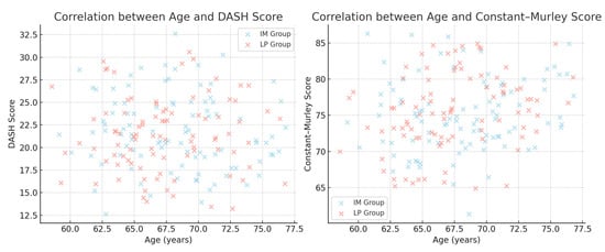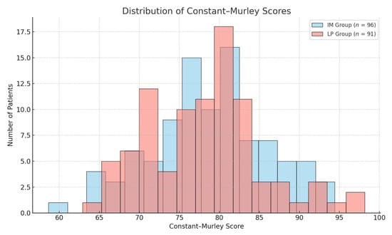 The mean DASH scores were 20.6 ± 6.1 in the IM group and 21.2 ± 5.3 in the LP group (p = 0.484), while the Constant–Murley Scores were 79.6 ± 8.0 and 77.5 ± 7.6, respectively (p = 0.057). The overlap of 95% confidence intervals further confirmed the comparability of the two techniques.