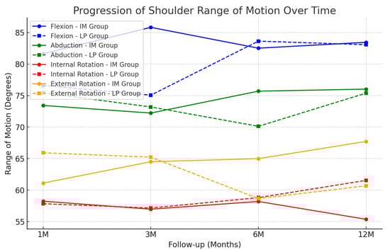 No statistically significant differences were observed between the two groups in terms of shoulder ROM at any time point. The progression of shoulder motion is shown in