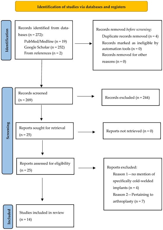 Our search yielded 272 articles initially. After we removed duplicates and then screened the titles and abstracts, 25 appeared to meet the inclusion criteria for further analysis. Four papers were subsequently excluded due to a lack of a description of the removal technique specifically utilized for cold-welded implants. After discussion with a third reviewer, the decision was made to exclude 7 papers that dealt with the concept of cold fusion in the context of arthroplasty surgery, leaving a total of 14 [13,17,18,19,20,21,22,23,24,25,26,27,28,29] papers for in-depth analysis. A further paper was put forward by a third reviewer pertaining to an incidence of cold welding of a proximal lag screw discovered upon removal of a proximal femoral nail [29].