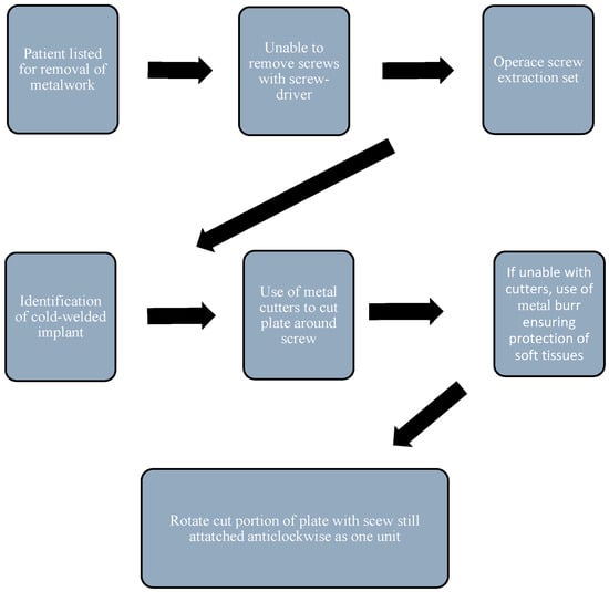 It is clear from our research that the most commonly performed technique for the removal of a cold-welded screw is to cut the plate either side of the screw and rotate anticlockwise in order to remove the screw/plate as one unit. An important consideration is the mechanism by which the plate is cut—it is preferable to use a technique that produces as little metal debris as possible, preferably using metal cutters. If this is not achievable, and a carbine burr needs to be used, steps should be taken to minimize soft tissue contamination with metal debris by using techniques such as the utilization of a saline-soaked gauze or careful irrigation.