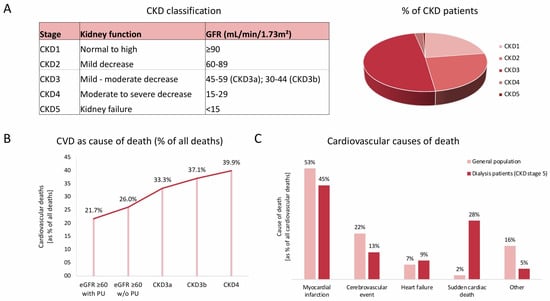 Chronic kidney disease (CKD) and associated elevated cardiovascular risk, adapted from [2]. (A) CKD classification; (B) CKD and cardiovascular death (CVD); (C) CVD in general population and CKD.