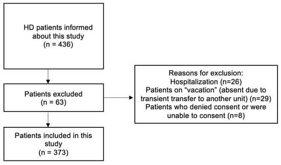 Among the 436 HD patients who were informed about this study, 373 were included, resulting in a response rate of 85.6% (Figure 1). Overall, the survey included 373 patients (125 females; mean age 65.7 ± 14.8 years) with ESRD treated with chronic HD. The clinical profile of the sample is shown in Table 1.