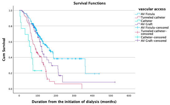It is noteworthy to mention that survival was higher in those patients with fistulas, i.e., 165 months (95% CI, 17 to 132 months). This finding is in accordance with many lines of evidence [22,23,24,25,26,27,28,29,30,31,32,33,34,35]. More specifically, the present study revealed higher survival rates in the group of patients with a fistula, followed by the group of patients with a graft, and then by those with a permanent catheter, while the lowest survival was observed in the group of patients with a temporary catheter. Thus, the present study showed that AV fistulas carry the lowest risk, whereas nontunneled catheters appeared particularly hazardous and should be avoided when alternative types of vascular access are feasible.