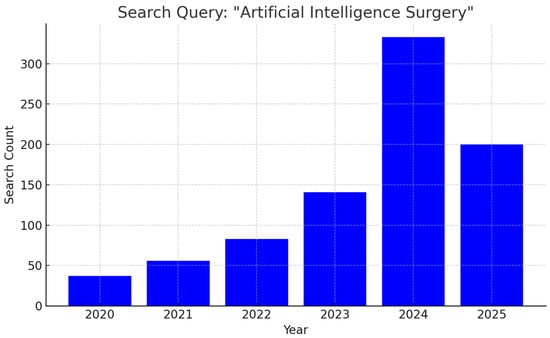 Bar graph illustrating the year-by-year growth in peer-reviewed articles addressing applications of artificial intelligence in surgical practice.