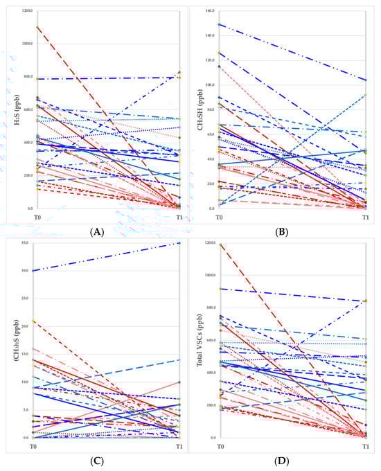 Changes in the values of volatile sulfur compounds (VSCs) measured at baseline (T0) and a month later (T1). (A) Hydrogen sulfide (H2S), (B) methyl mercaptan (CH3SH), (C) dimethyl sulfide ((CH3)2S), (D) total VSC level. Each red line represents an individual participant (n = 15) in the CPC mouthwash group, and each blue line represents an individual participant (n = 15) in the placebo mouthwash group.