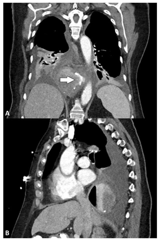 Computed tomography: (A) coronal and (B) sagittal views showing air and fluid collection surrounding the distal esophagus with oral contrast extravasation (arrow).