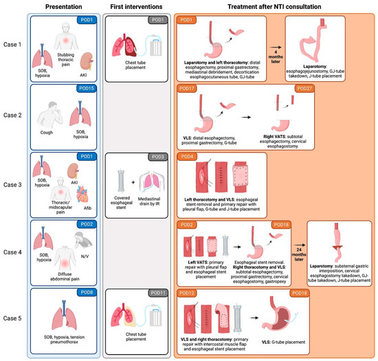 A summary of the clinical presentation and therapeutic interventions of each case is presented in Figure 2. The median time between index surgery and NTI consult was 4 days (IQR: 1.5–14.5; range 1–17), whereas the median time between clinical presentation and consultation by our department was 2 days (IQR: 0–3), ranging from 0 to 4 days. Four (80%) perforations were surgically or endoscopically identified in the distal esophagus, while one (20%) was located in the middle thoracic esophagus. Two (40%) patients (case 1 and 2) were treated with distal esophagectomy, proximal gastrectomy, and esophagostomy on postoperative day (POD) #1 and POD #17, respectively. The other three (60%) patients (cases 3, 4, and 5) underwent covered esophageal stent placement.