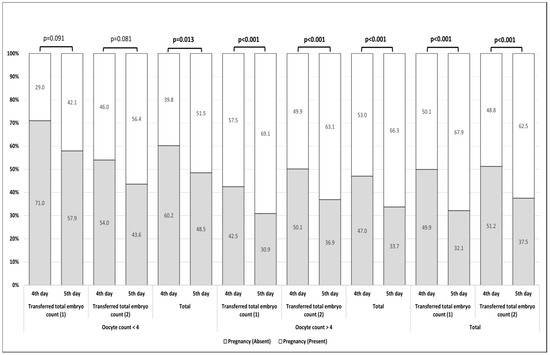 If the number of transferred embryos is one or two and the number of oocytes is greater than four, pregnancy success is substantially higher on day 5 compared to day 4. (p < 0.001)