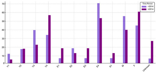 Distribution (%) of UC patient characteristics before 2014 and starting with 2014 (V1—age under 6 years; V2—age between 6 and 9 years; V3—age between 10 and 13 years; V4—age between 14 and 17 years).