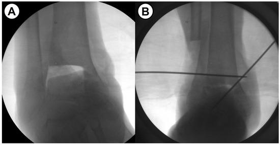 - Lindsey, B.B.; Hundal, R.; Bakshi, N.K.; Holmes, J.R.; Talusan, P.G.; Walton, D.M. Ankle arthrodesis through an anterior approach. J. Orthop. Trauma 2020, 34, S42–S43. [Google Scholar] [CrossRef]