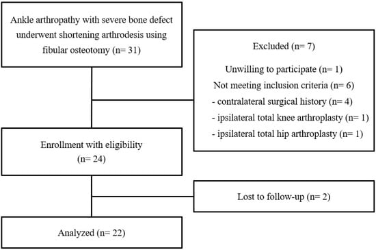 We retrospectively reviewed a total of 31 patients treated with shortening arthrodesis using fibular osteotomy for ankle arthropathy with severe bone defect between May 2013 and March 2022. Twenty-two patients were eligible, including a minimum follow-up of 3 years, and analyzed in this study (Figure 2). The causes of ankle joint destruction were failed total ankle arthroplasty (TAA) (7 cases), neglected ankle fracture (6 cases), delayed diagnosis of degenerative arthritis (5 cases), avascular necrosis of talus (2 cases), and diabetic neuroarthropathy (2 cases). The inclusion criteria for this study were as follows: (1) no arthroplasty or arthrodesis history in major joints of contralateral lower extremity, (2) no history of ipsilateral total knee arthroplasty (TKA), (3) no history of ipsilateral total hip arthroplasty (THA), and (4) no concomitant adjacent (subtalar or talonavicular joint) arthritis to need the arthrodesis. The patients with concomitant adjacent joints (subtalar or talonavicular) arthritis needing the arthrodesis were excluded due to the possibility of negative effects on the clinical outcomes. Because of the potential to be a confounding variable on the exact evaluation of leg length discrepancy following the shortening arthrodesis, patients with a history of arthroplasty or arthrodesis major joints (hip, knee, and ankle) of contralateral or ipsilateral lower extremity were excluded. Four patients with contralateral surgical history (2 TKA, 1 TAA, and 1 ankle fusion), one with ipsilateral TKA, and one with ipsilateral THA were excluded. In addition, one patient was unwilling to participate and was excluded from this study. The decision making to perform shortening ankle arthrodesis was based on intraoperative direct inspection for bone defect size. Following the removal of TAA prosthesis or residual cartilage, large bone deficiency more than 2 cm in diameter or height was considered a severe defect, making sufficient filling with cancellous autograft alone difficult.