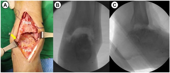 (A) Intraoperative photograph shows subchondral preparation (multiple drilling) following the removal of remaining cartilage and necrotic bone in a 63-year-old female patient with avascular necrosis of the talus (arrow: medial malleolus). (B,C) Intraoperative fluoroscopic images show a large defect space between tibial plafond and talar dome.