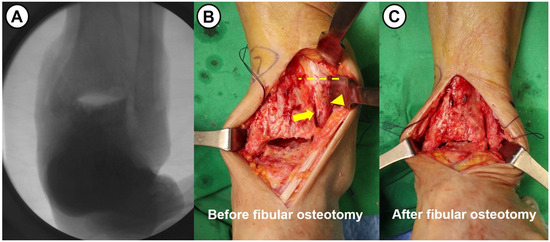 (A) Intraoperative fluoroscopic image demonstrating a challenging problem in securing sufficient contact area for ankle fusion. (B,C) Intraoperative photographs show a difference in defect size between before and after the fibular osteotomy above distal tibiofibular syndesmosis (dotline: fibular osteotomy site, arrow: tibiofibular syndesmosis, arrowhead: fibula).