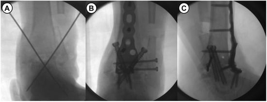 Although the clinical and radiological outcomes following various surgical techniques (arthroscopic, open approach, transfibular, TTC fusion, etc.) have been reported by many authors, there is no consensus on the best surgical approach and fixation device. Notably, there are few published studies objectively comparing the results between surgical techniques for end-stage ankle arthropathy with severe bone defect. Although arthroscopic fusion shows the advantages (fast time to union, low complication rates, short hospital stay, and quick postoperative recovery) of a minimally invasive procedure, this technique is known to be ideal for patients with minimal deformity and preserved bone stock. Medial, lateral, or anterior open approaches can provide better visualization for deformity correction and bone graft, despite more soft tissue disruption and hardware-related complications. Despite concerns of higher complication rates and increased risk of nonunion, TTC fusion is used as a salvage procedure to stabilize the entire hindfoot in cases of hindfoot pathology with severe deformity and poor bone quality, failed previous fusion or TAA, and Charcot neuroarthropathy. In terms of fixation devices, Mitchell et al. reported that compression screws alone demonstrated a higher nonunion rate (15.4%) than anterior plate augmentation (7.7%) with compression screws fixation []. Another comparative study also reported a better fusion rate (100%) in patients with anterior plate augmentation of compression screw fixation compared to patients (82%) with compression screws alone [].