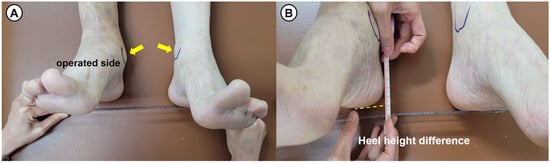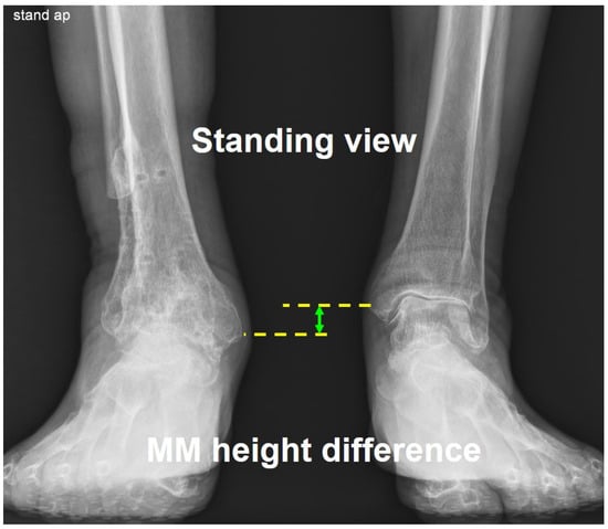 Prior to conducting this study, spine malleolar distance (SMD), long cassette view, and Bell–Thompson scanography were attempted to evaluate the leg length discrepancy. However, we determined that there were limitations in accuracy of these measurement methods. As an indicator of the leg length discrepancy in this study, we used the heel height difference, which measures the difference in height between both heels of patient in supine position (see Figure 6). Additionally, the leg length difference was evaluated radiologically by measuring the height difference between both medial malleolus in the standing radiograph, called the medial malleolar height difference (see Figure 7).