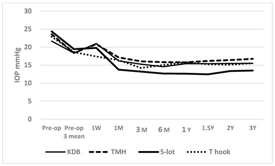 Postoperatively, the IOP between 1 month and 3 years was significantly lower than preoperative IOP in all four cohorts, with a p < 0.001 using the Wilcoxon signed-rank test. A short-term elevation in IOP was observed at 1 week in the KDB, TMH, and S-lot cohorts, likely reflecting the effects of postoperative intracameral bleeding. Despite this early increase, the IOP at 1 week remained significantly lower than preoperative levels in the TMH (p = 0.005), S-lot (p = 0.011), and T-hook (p < 0.001) cohorts; however, the reduction in the KDB cohort was not significant (p = 0.198).
