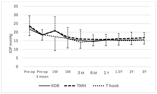 When comparing postoperative IOP among three sectorial COS cohorts (KDB, TMH, and T-hook), a transient elevation above the mean of three preoperative IOP measurements at 1 week was observed in KDB and TMH cohorts (Figure 2). According to Dunnett’s multiple comparison test, IOP measurements in the KDB (p = 0.063) and TMK (p = 0.052) cohorts at 1 week were marginally higher than in the T-hook cohort, possibly due to greater intracameral bleeding and clot formation in the KDB and TMH cohorts (Table 4 and Table 5). The significant difference in IOP between the T-hook cohort and TMH cohort at 3 months (p = 0.029), according to Dunnett’s multiple comparison test, may also reflect effects of intracameral bleedings (Table 2). After 3 months, no significant differences in IOP were detected among the three sectorial COS groups through 3 years of follow-up (Table 2).