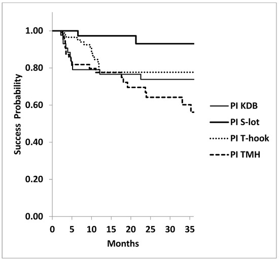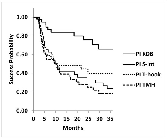 The success probability for achieving ≥20% IOP reduction at three years in KDB, S-lot, T-hook, and TMH was 59.2 ± 7.7%, 78.4 ± 7.7%, 56.3 ± 10.0%, and 45.1 ± 8.1%, respectively. And the difference was marginally significant (p = 0.0518, log-rank test).