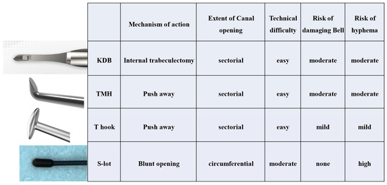 - Chihara, E.; Chihara, T. Development and Application of a New T-shaped Internal Trabeculotomy Hook (T-hook). Clin. Ophthalmol. 2022, 16, 3919–3926. [Google Scholar] [CrossRef]