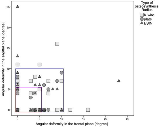 Reduction quality depending on the osteosynthesis procedure. Each symbol (triangle, square or circle) represents one patient. The measurement of the angular deformity in the frontal and sagittal plane was recorded in the postoperative X-ray. The symbols within the red square belong to group 1. An angular deformity of less than or equal to 5 degrees was measured in these patients in the sagittal or frontal planes. The symbols within the blue square belong to group 2. Here, an angular deformity of 6 to 10 degrees was measured postoperatively in the sagittal or frontal plane. All other patients belong to group 3. In these patients, an angular deformity greater than 10 degrees was measured in the sagittal or frontal plane. There were no patients in group 3 who had undergone plate osteosynthesis. A postoperative restriction of movement was significantly more frequently associated with a poorer reduction result (p = 0.02).