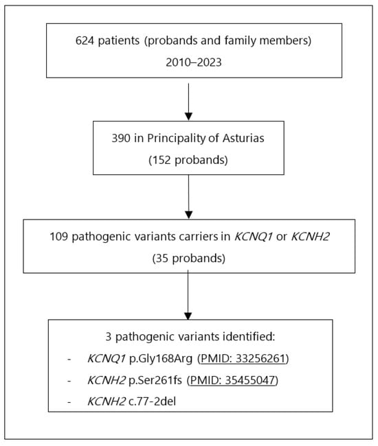 A review was conducted on all index cases and family members referred for genetic testing between 2010 and June 2023. Only patients from the Principality of Asturias were included in this study. Among 390 patients (152 probands), 109 were carriers of pathogenic variants in KCNQ1 or KCNH2 (35 probands). Two pathogenic variants in KCNH2 and one in KCNQ1 were identified with more than five carriers (Figure 1). All patients identified with pathogenic variants of LQTS Type 2 were included in the study.