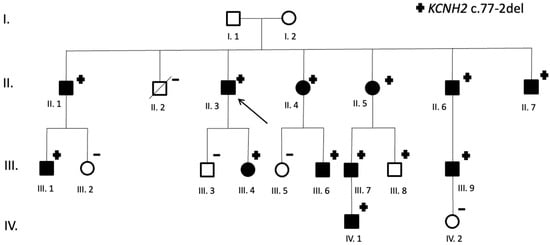 Family pedigree (KCNH2 c.77-2del carriers). Symbols denote sex and disease status: +, carriers; −, noncarriers; without a sign, genetic status unknown; box, male; circle, female; box/circle black darkened, LQTS phenotype; box/circle clear, negative phenotype; slashed, deceased; arrow, proband.