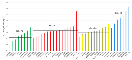 Values of max in mL/min/Kg according to practiced sports discipline, divided into skill (green), power (red), mixed (yellow) and endurance (blue) categories.