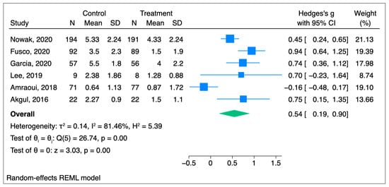 The mean pain value in the hypnosis group is 0.54 SD lower than that in the placebo group; the difference has a medium effect and is statistically significant (95% CI [0.19–0.90], p = 0.0024). Hedge’s g score for the study by Amraoui et al., 2018, was negative [24]. The pain score in Amraoui et al. was higher in the hypnosis group than in the control/placebo group. All other studies demonstrated the effectiveness of hypnosis for acute pain treatment. Heterogeneity was found to be high; I2 = 81.46%, as depicted in Figure 2.
