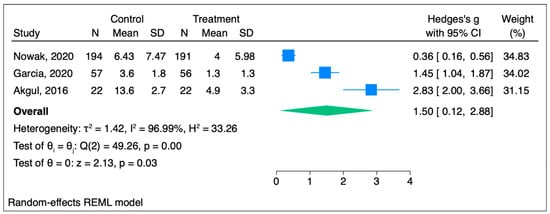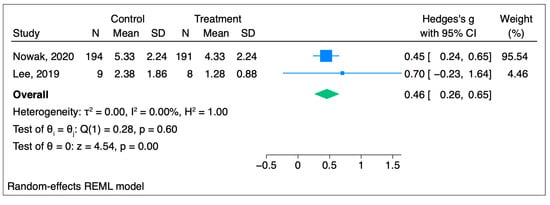 OME in the hypnosis group was 1.5 mg SDs lower than in that in the placebo group, and the difference had a significant effect as the Hedge’s g score was more than 0.8. The forest plot in Figure 3 shows that the difference is statistically significant (95% CI [0.12,2.88]; p = 0.03).